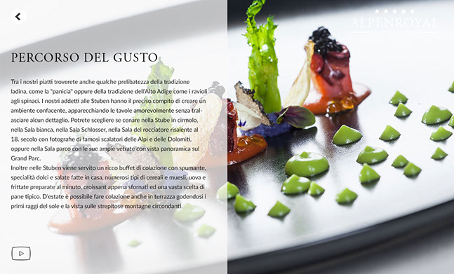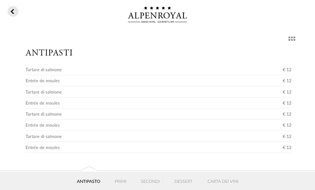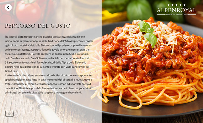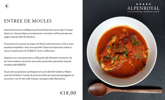 Menù digitale elegante, smart, dinamico e multilingua, facilmente consultabile dagli utenti del web o dai tuoi clienti. Il servizio rapido e sempre aggiornato, offre la possibilità ai tuoi acquirenti di vivere un’esperienza unica e sempre diversa rendendo immersivo l'ecosistema informativo del brand.